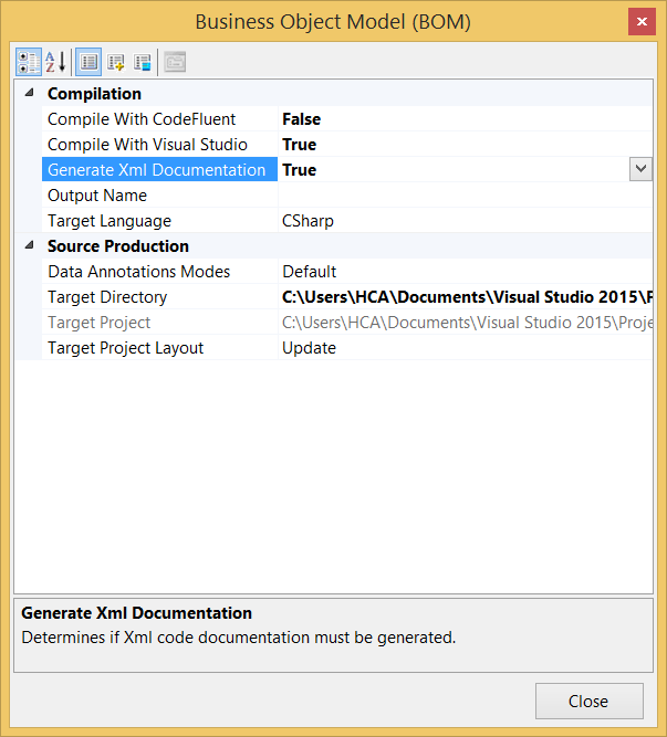 Note: The Generate Xml Documentation property is on the BOM Producer as it's the BOM Producer which generates the actual XML comments. The documentation sub-producer focuses on creating all the corresponding Messages in the _doc class, which are then translated by the BOM Producer into XML remarks.