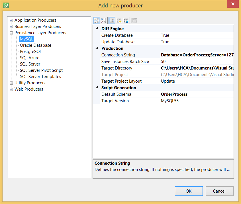 - Target Directory: specifies where to generate the scripts, connectionString: defines the connection string to use to connect to the database and run the scripts ("{0}" is an alias to the default namespace),