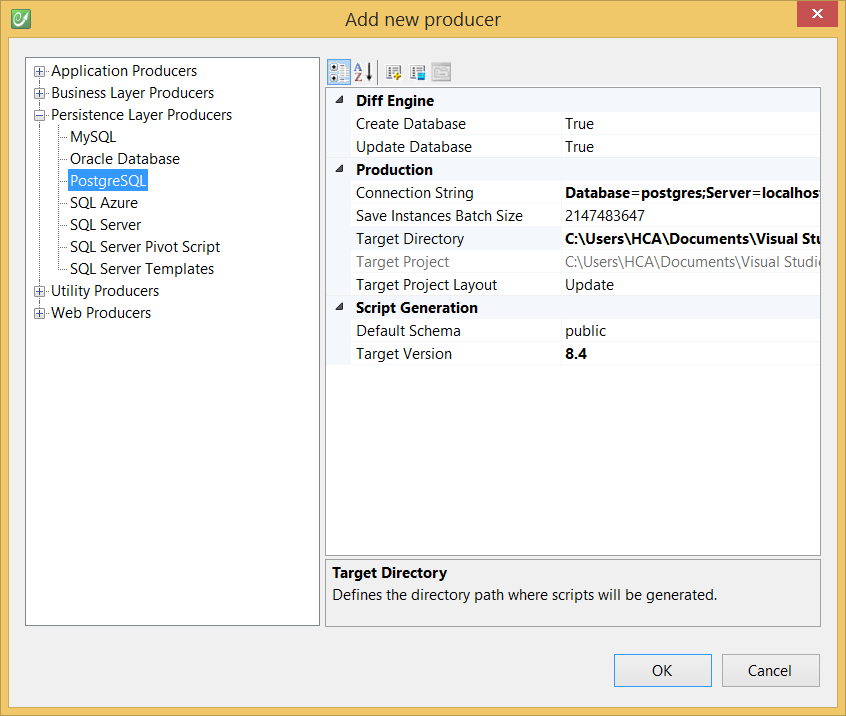 The PostgreSQL Producer is available in the Persistence Layer Producers section of the Add New Producer window.