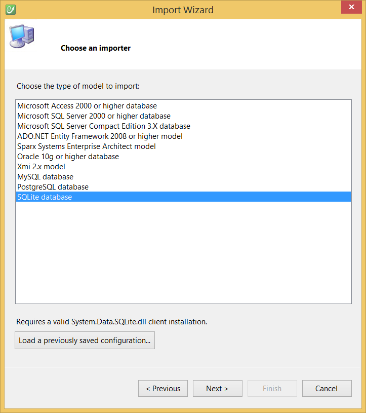 This topic details how to import an existing SQLite database to a CodeFluent Entities model.