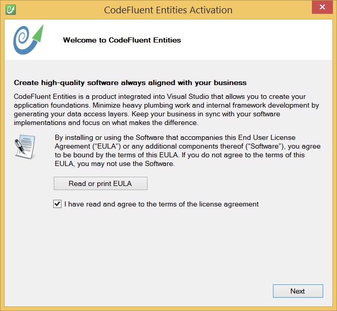 On your first use of CodeFluent Entities you will need to register your license. First, accept the End User License Agreement.
