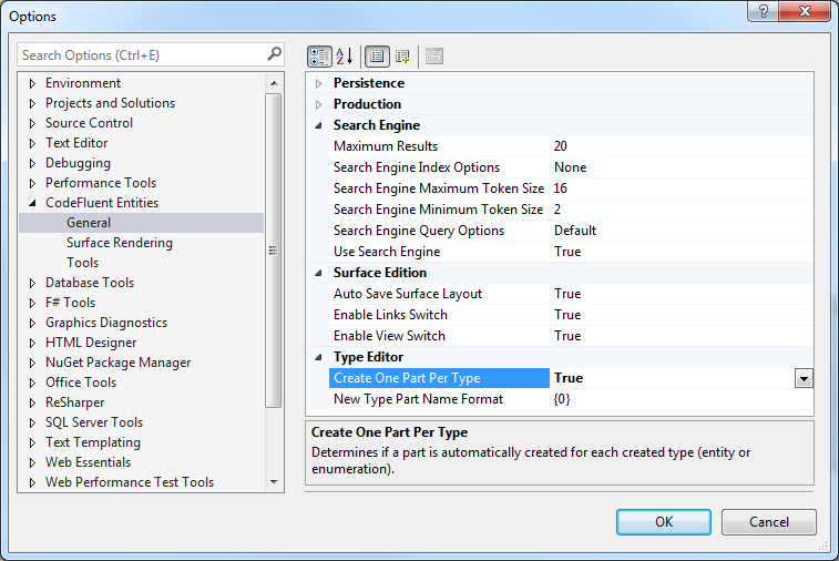 CodeFluent Entities allows you to automatically create a new part each time you create a new entity or enumeration. This option is available in the Visual Studio options: