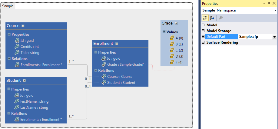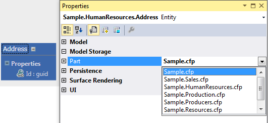 CodeFluent Entities allows you to split the model into multiple parts (the storage unit, using an XML syntax in .XML or .CFP files) and multiple surfaces (used for visualization and editing).